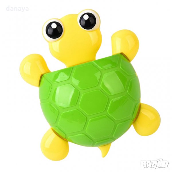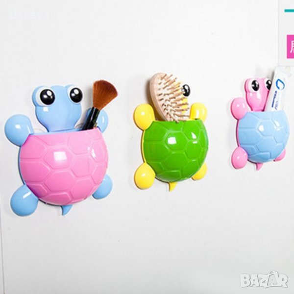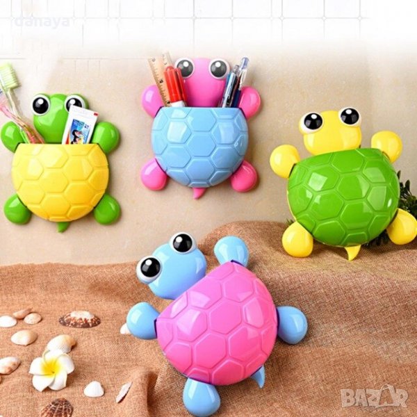 поставка за четки за зъби с форма на весело костенурче. Поставката се монтира с 3 вакуум вендузи. Може да се постави върху всякакви гладки повърхности като огледала, стъкла, добре гланцирани плочки. Предлага се в 4 варианта - син с розови крайници, розов със сини крайници, зелен с жълти крайници, жълт със зелени крайници