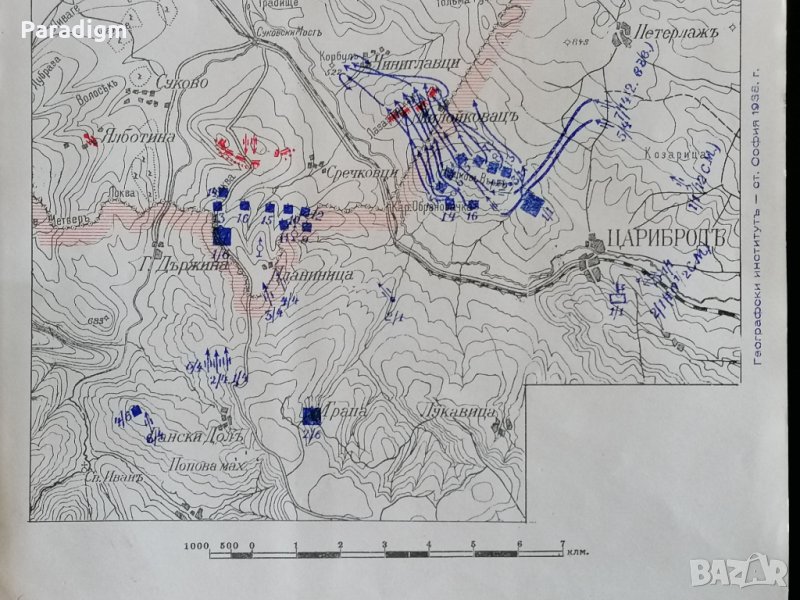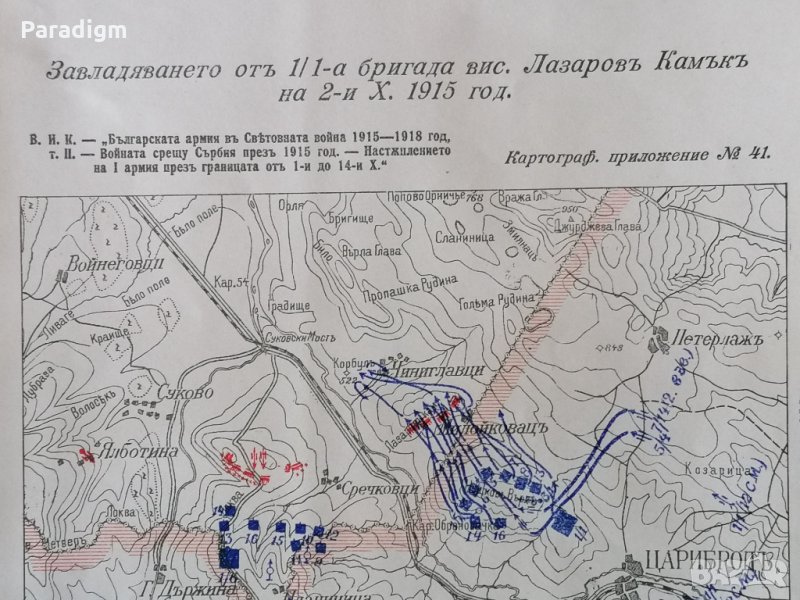 Стара карта, изобразяваща завладяването на вис. Лазаров Камък от 1/1-а бригада на 02.10.1915г.