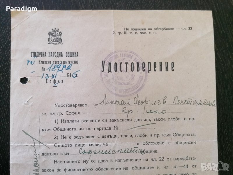 Удостоврение от Столична народна община от 1946г.