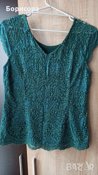 Стилна блуза, изработена от еластична дантела в зелен цвят. Отвътре има подплата. В отлично състояние е, обличана броени пъти. Чудесна е за официален повод.
