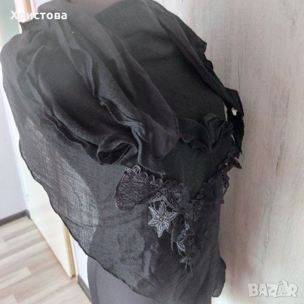 Дамски черен ефирен шал с форма на триъгълник. От два плата като горният е по-тънък. Символични цени на всички дрешки в профила ми. Опция тест и преглед. Доставка с отстъпка до офис ЕКОНТ. 0899243418