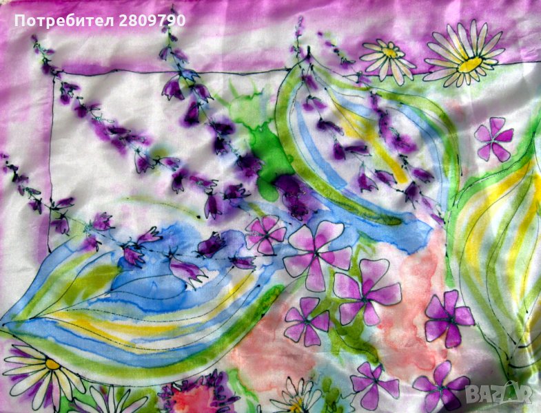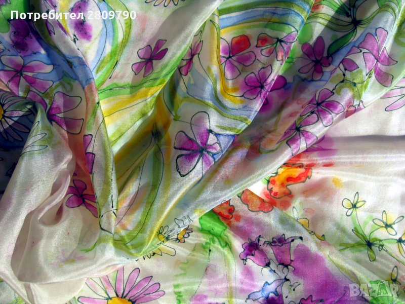 Шалът се оказа деликатен и нежен. Какво допринесе най-много? Дали беше тънката, естествена коприна, наречена Pongee - 5 или excelsior, или бяха акварели и маргаритки, които да съответстват на плата? Шалът е ръчно рисуван в едно копие с немски фиксирани с пара багрила, които работят не по-рано от няколко часа. Ръбовете на шалчето са зашити от автора лично на ръка с естествени копринени конци.