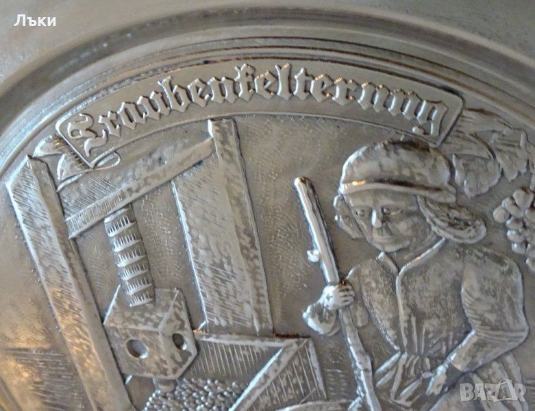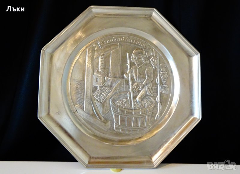 изработка от калай с релефна картина Гроздобер,производство на вино.Прецизен рисунък и сребърен блясък.Маркировка.Диаметър 24 см.,височина 1 см.,тегло 340 гр.