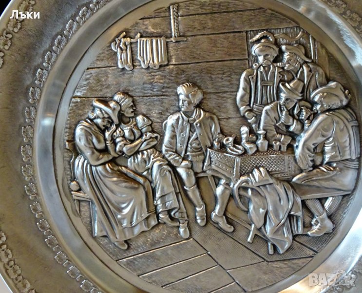 изработка от калай,маркировка.С изключителна прецизност и внимание към всеки детайл е представена сцена на ловци и две дами,които се забавляват в гостилница.Виждат се дори шарките на покривката и ивиците на дървените дъски.По