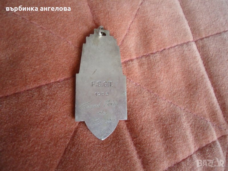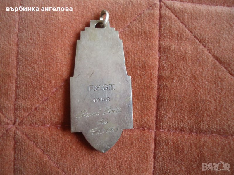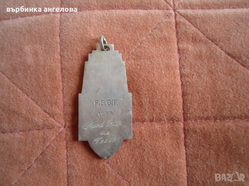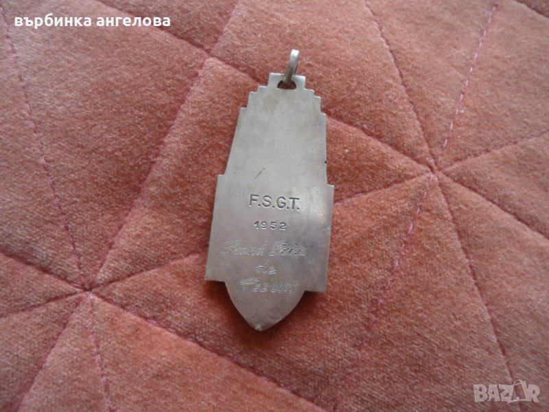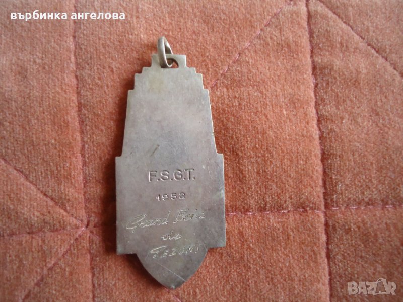 Френски медал 1952г. F.S.G.T. 1952 Grand Prix de Bezons. Размери 47х20мм. Тегло около 12гр. Медалът е със сребърно покритие. Доставка с ЕКОНТ наложен платеж. Доставката сепоема от купувача.