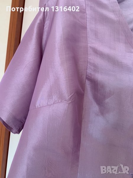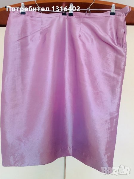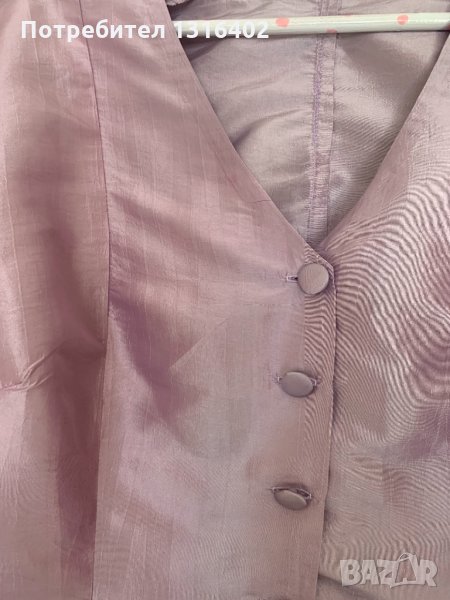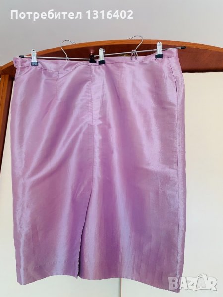 Официален костюм от две части, промазана материя, без заблежки, размер 4XL, риза -ширина под мишници 70см,дължина 70см, пола- талия 59см,ханш 65см,дължина 73см, цвят пепел от рози,полата е прав модел.