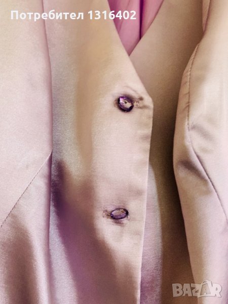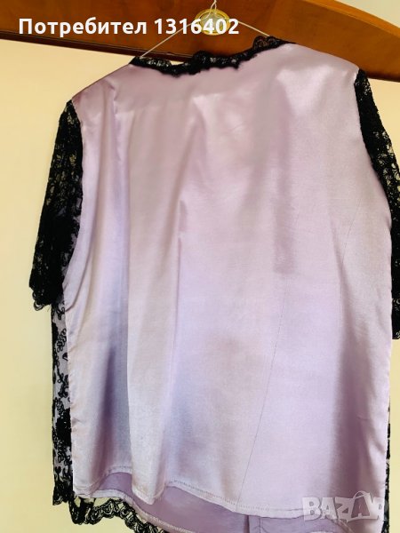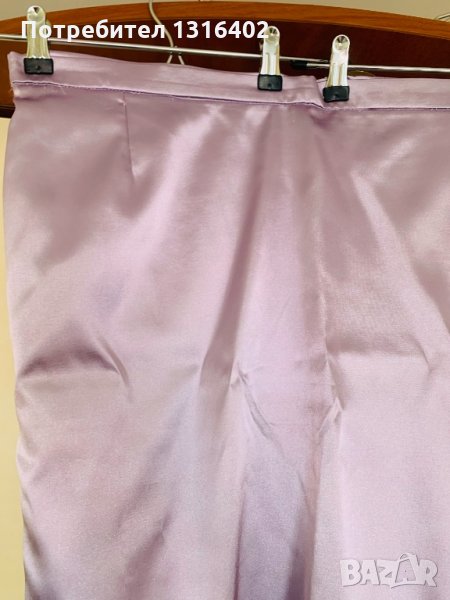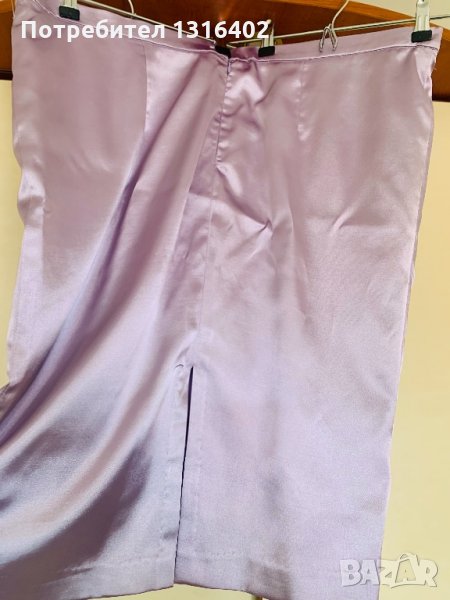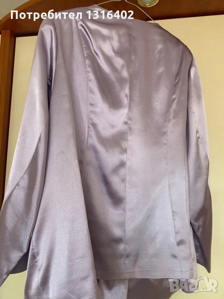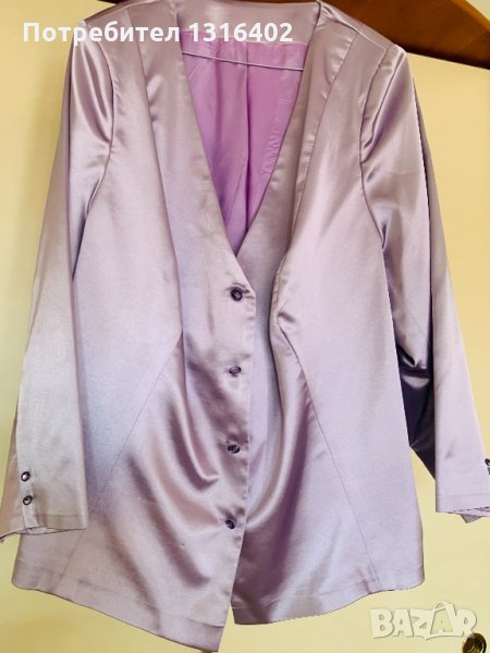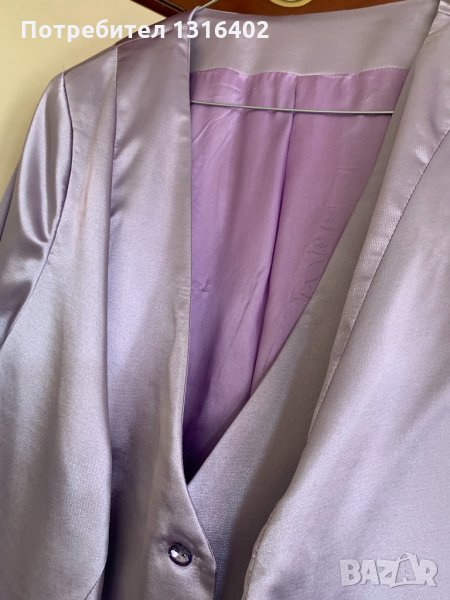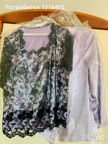 Официален костюм от три части, сатенена материя с черна дантела, бледо лилав цвят,без никакви забележки, след химическо чистене е, размер 4XL, размери риза - ширина под мишници 67см,дължина 68см, пола -талия 58см,ханш 66см,дължина 70см, сако- ширина под мишници 70см,дължина 72см,ръкав 60см.