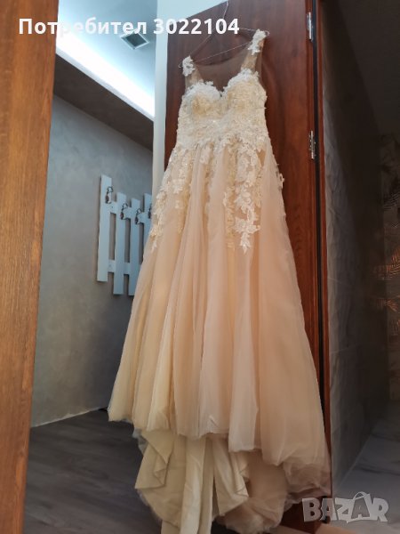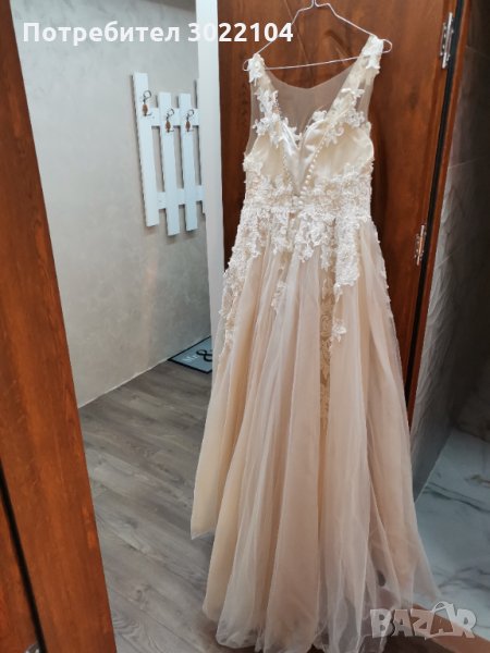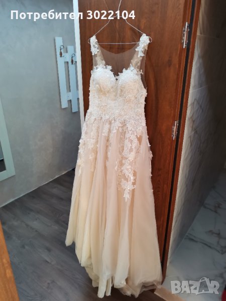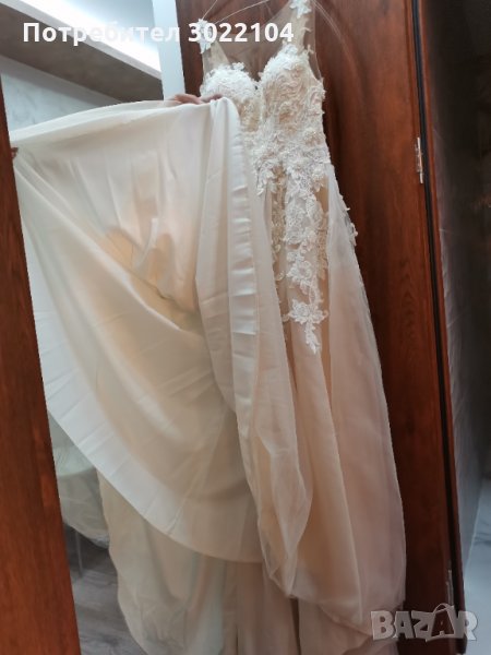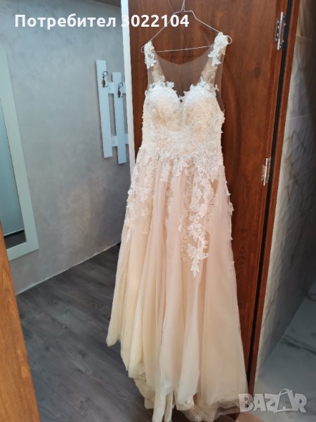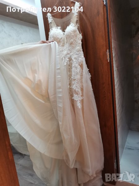 Роклята е като нова, обличана е за проба и направа на няколко снимки върху модел! Артикула е поръчков и готов за най-важния ден в живота на новата си собственичка! Размер M-L
