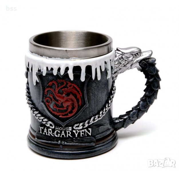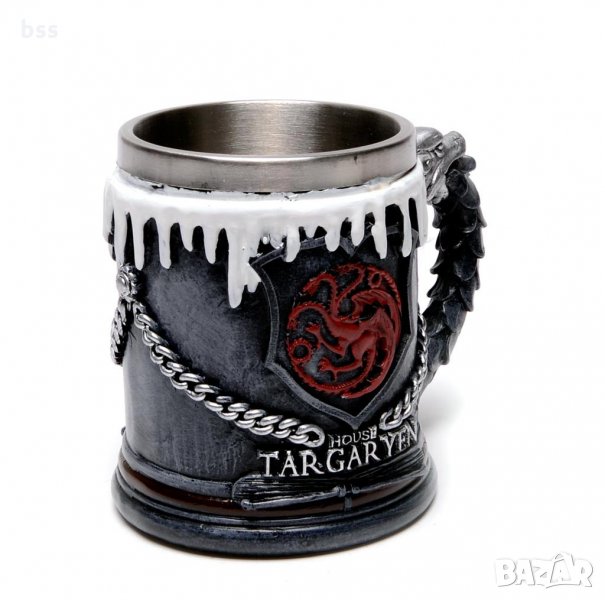 Стилна чаша от полирезин с релефни декорации от филма Игри на тронове, герба на Клан Таргариен, Къщата на дракона, сняг и вериги, а на дръжката вълча глава.