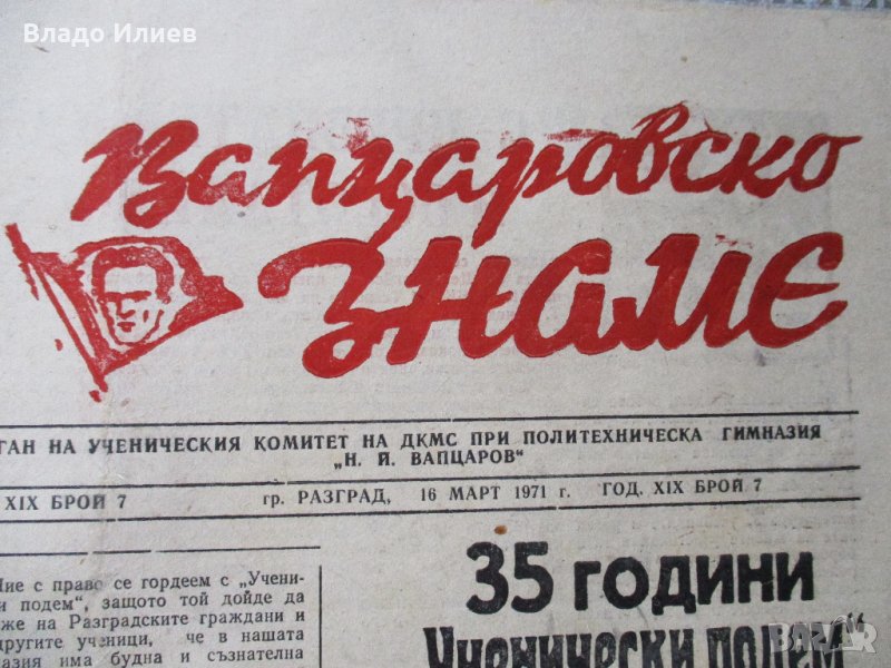 Вестниците са:"Екип 7"-Разград-1-ят му брой от 1990 г.,"Старт","Орбита"-1972 г.-1 брой,1973 г.-3 броя от 17 февруари и 2 август,1977 г.–1 брой."Трезвеност","Ново Лудогорие","Жар"-брой 21 от 24.5.1973 г.,"Учителско дело","Литературен фронт","Антени","Септемврийче"-един от броевете е брой 88 от 1.09.1975 г."Другарче","Вапцаровско знаме"-орган на гимназия "Н.Й.Вапцаров"-Разград от 1971 г.Юбилейният 10-ти брой с най-добрите първи страници на вестник"България днес"."Пулс"-брой 16 от 16.04.1985 г.