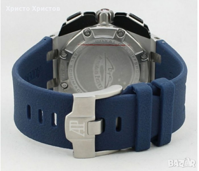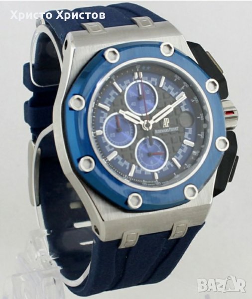 Audemars Piguet Offshore Schumacher, кварц, хронограф, син релефен циферблат с дата в позиция 3 часа, фосфоресциращи стрелки, маркери, син безел, L316 полиран стоманен корпус и синя каучукова с оригинално закопчаване.Луксозна кутия оригинална 120 лв.
