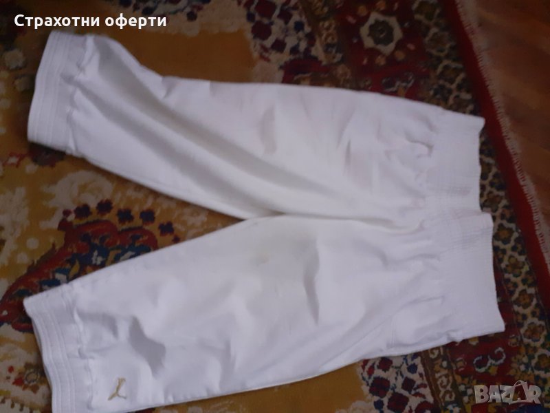 Панталонът е дължина около коляното 3/4, размерът го има на снимките, според мен ще стане и на човек Л размер. Цветът е чисто бял със златист символ на пума, ластична материя. При интерес пишете