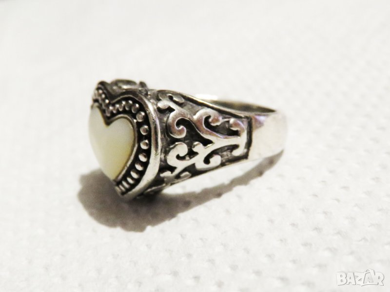 Старинен красив сребърен пръстен със сърце от бял кралски седеф - камъка на новото начало и семейството.