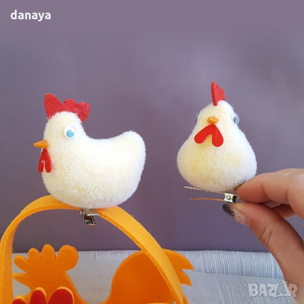 Комплект от 2 броя декоративни щипки за великденска украса с форма на кокошки. Атрактивни и красиви! Може да ги защитете на великденската кошница за яйца, на клонка или друг предмет. Изработени от стиропор, филц и изкуствени нишки.