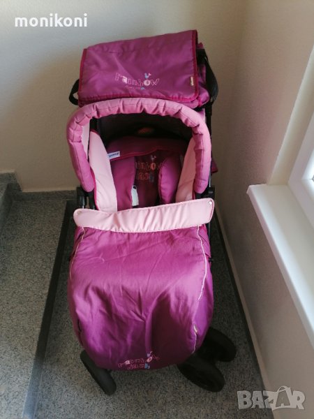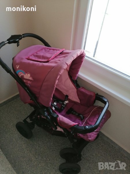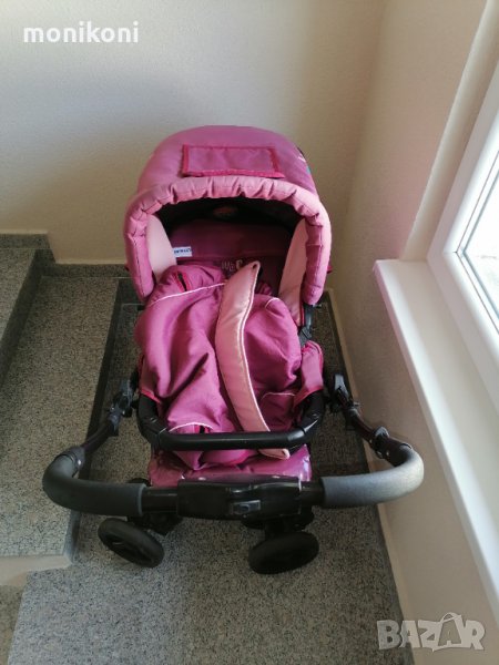 В перфектно състояние! Добавям бейбипорт, който е закупен отделно. Въртящи се колелца на 360°,обръщаща се дръжка, чувалче за крачетата, чанта и комарник.