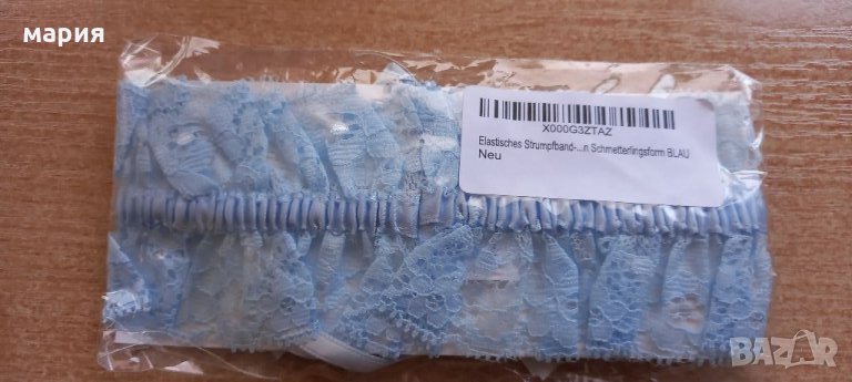 Чисто нов жартиер в нежен син цвят.Дантела,панделка и камъни,образуващи пеперуда.Донесен от Германия.
