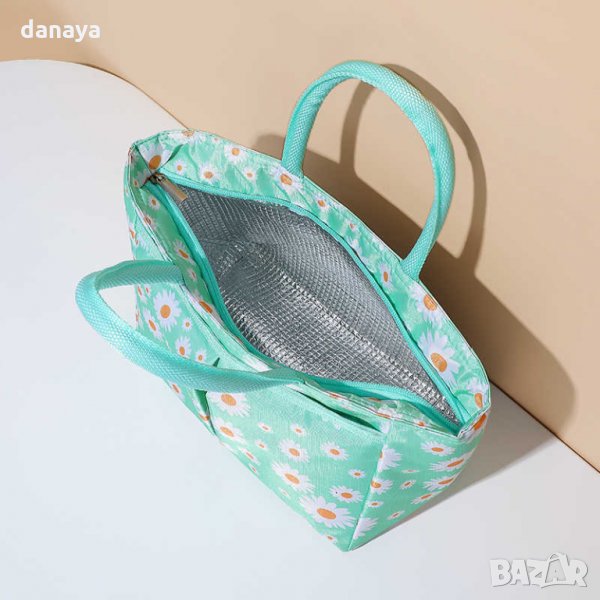 Термо чанта за храна в различни цветове и принт на бели маргаритки. Термо чанта, подходяща за плаж, пикник, риболов, разходки, къмпинг. Запазва температурата на поставените храни и напитки за няколко часа, благодарение на изолиращото фолио от вътрешната страна. Лека, удобна за пренасяне и употреба. В лицевата си страна има голям джоб, затварящ се с цип, за поставяне на допълнителни аксесоари, като телефон, книга и др. Удобно затваряне и отваряне с цип, мекички дръжки за носене. Външната част е изработена от оксфорд плат, а вътрешната е покрита с изолиращо фолио. Чантата е идеална за лятото! Размери: (В) – 20см; (Д) – 24см; (дълбочина) – 14см