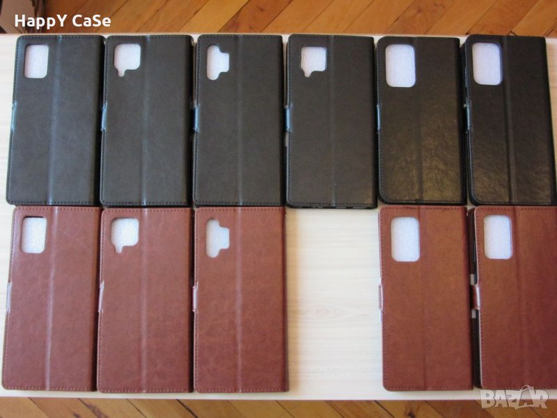 Последните шест снимки са реални. На снимки 10 и 11 са снимани калъфи отляво надясно за A02s, A32 5G, A42 и A72. При тях закопчалката се закопчава на горния капак (отпред) на калъфа.