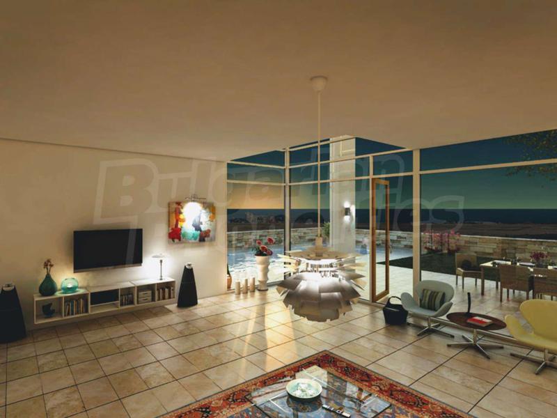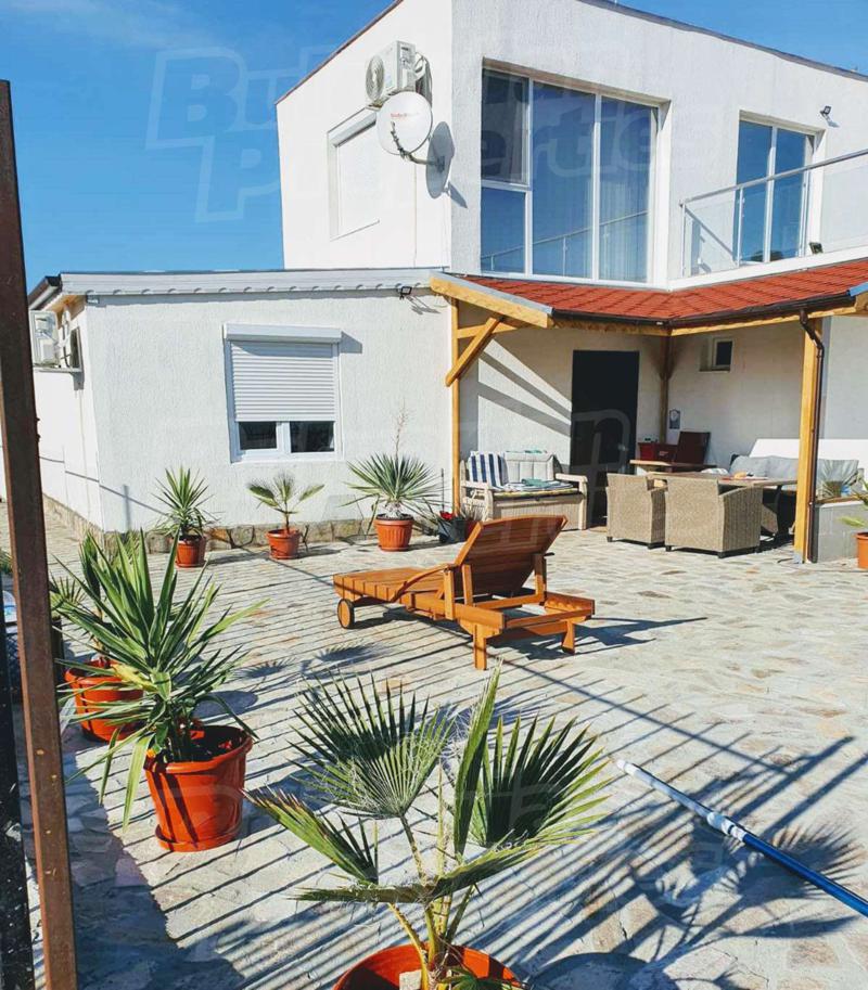 Къща с модерен дизайн с площ 170 м2 състои се от 3 спални, 2 бани, много голям хол с кухня /50м2 /, сервизни помещения и много голяма тераса, която гледа към морето.