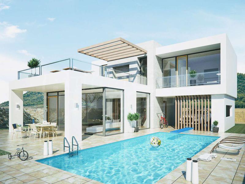 Къща с модерен дизайн с площ 220 м2 състои се от 4 спални, 2 бани, много голям хол и кухня, сервизни помещения и гараж, голяма открита тераса с гледка към морето.