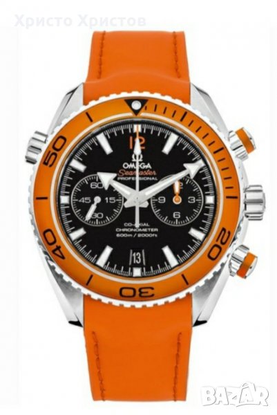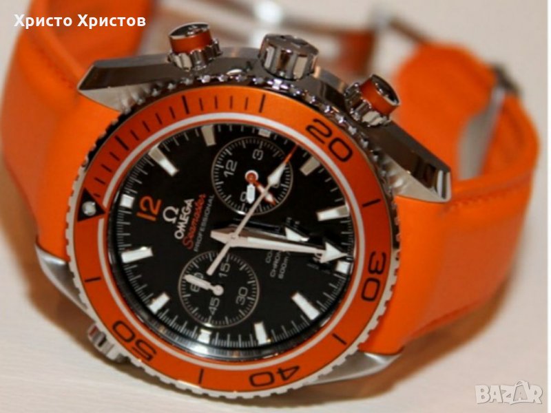 Луксозен ръчен часовник в Omega Seamaster Planet Ocean, кварц, хронограф, L316 полиран стоманен корпус, черен циферблат с втори часовник и дата в позиция 6 часа, фосфоресциращи стрелки, маркери и оранжева каучукова каишка с оригинално закопчаване.Опция водоустойчивост 80 лв.