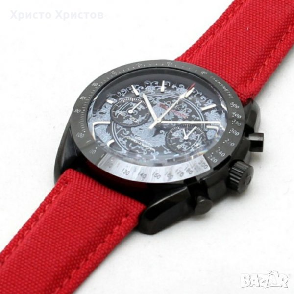 Omega Seаmaster, кварц, хронограф, стоманен корпус технология PVD покритие, ефектен черен циферблат с дата в позиция 6 часа, фосфоресциращи стрелки, маркери и червена платнена каишка с оригинално закопчаване.