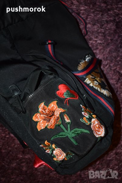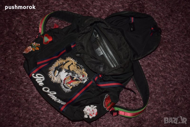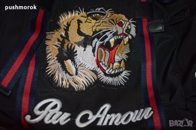 Изработена от технически плат, оборудвана с множество джобове и украсена с бродирани апликации, включително тигър, цветя и надписът„Слепи за любов”…, в комбинация и с естествена кожа. Дръжка за носене- лента в червено отгоре. Двойни регулируеми