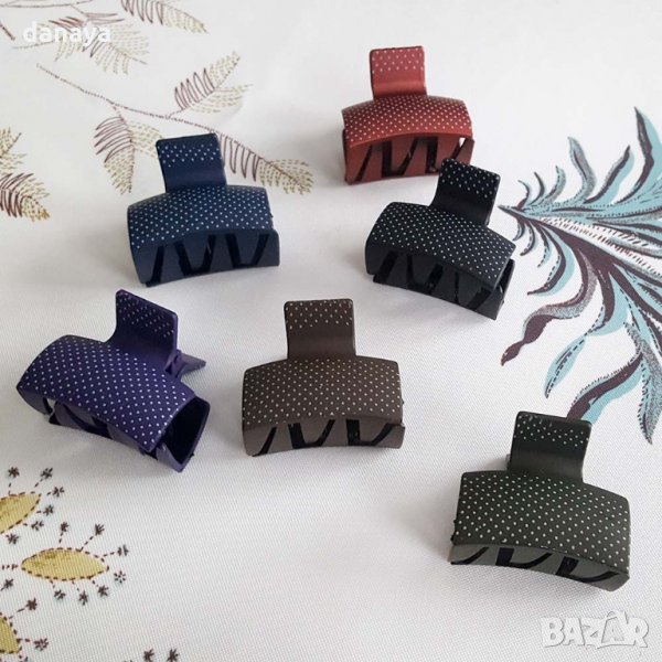 Малка шноличка за коса на бели точки. Компактна щипка за коса, лесно отваряне и стабилно захващане на косата. Общо 6 прибрани зъбци (по 3 от всяка страна). Практичен дамски аксесоар за всяка дама.