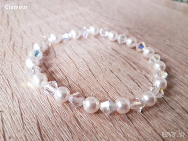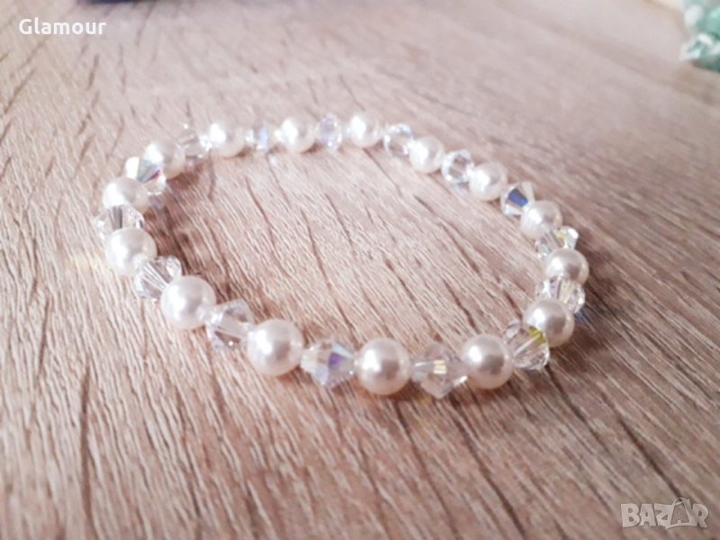 Гривна с бели перли/6мм кристални перли/и кристали /Conic 6mm: Crystal AB/на Сваровски.