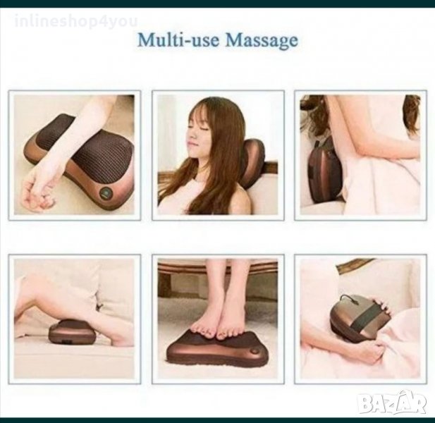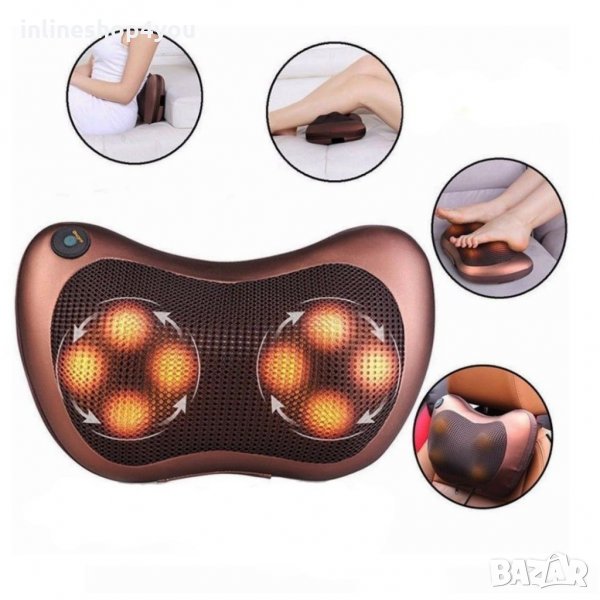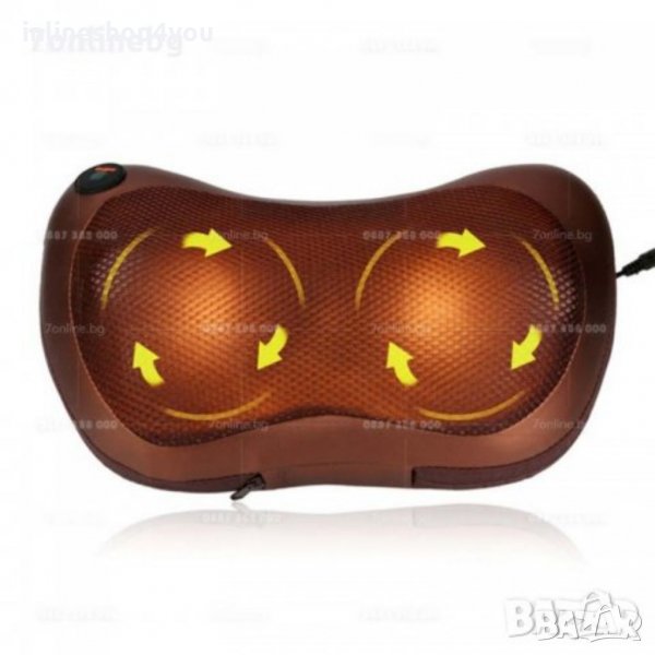 Тя разполага с 8 въртящи се глави за масаж с възможност за въртене двете посоки, осигуряващи дълбок масаж, в масажираната зона на тялото и спомага за облекчаване и премахване на главоболие, умора и стрес. Масажорът е лесно преносим. Може да го използвате както в дома и офиса, така и в колата, защото в комплекта е включен адаптер за кола.