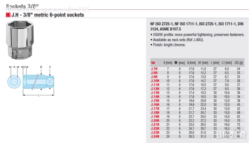 FACOM J.H Вложка 3/8" шестостенна - различни размери и цени