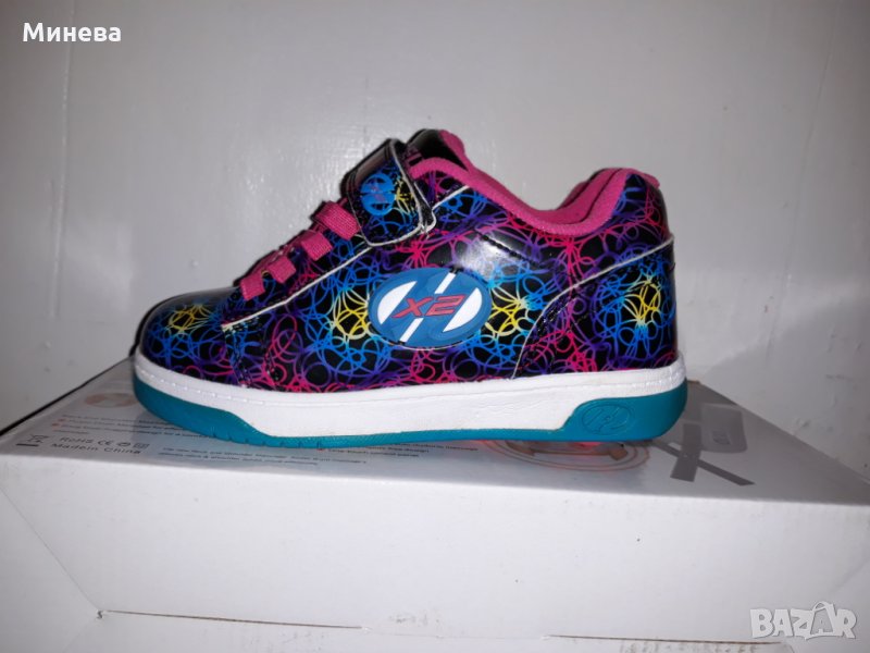 Маратонки обувки с колелца HEELYS, изцяло изработени от висококачествена кожа, в модерен принт и многообразие на цветови нюанси, много здрави и удобни, с по две колелца на обувка за по-голяма стабилност при каране. Номер 32 и дължина на стелката 19 см.