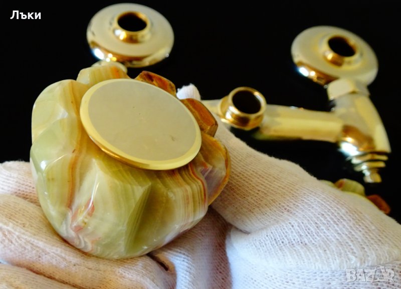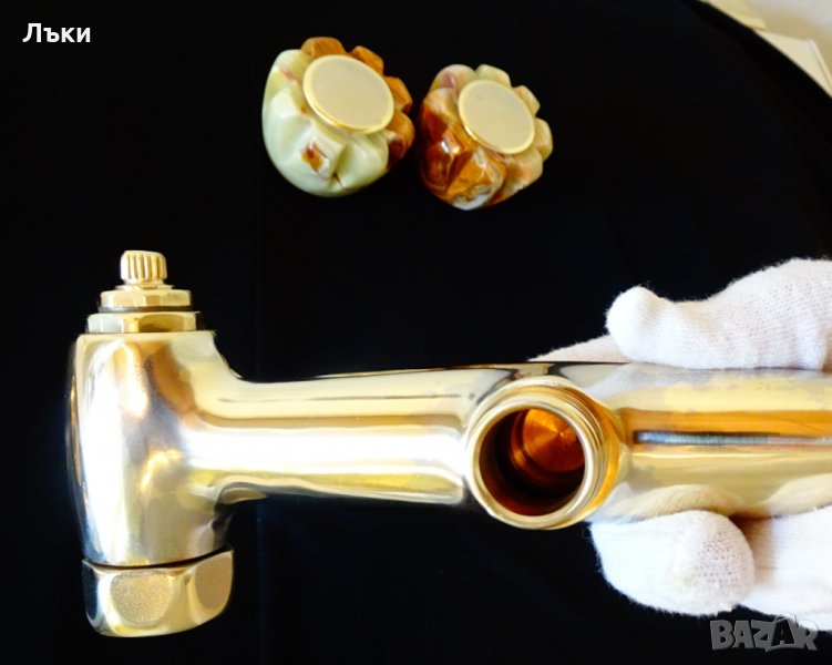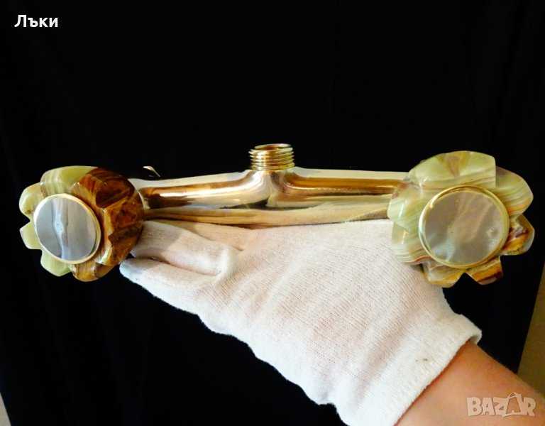 Италиански смесител за кухня изработен от масивен бронз,маркиран като патентован модел.Ръкохватките са ръчно изработени от много красив естествен оникс.Разстояние между ръкохватките 18 см.,тегло 1420 гр.