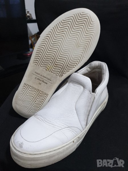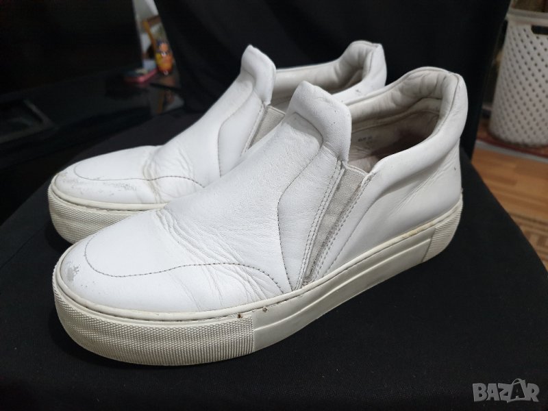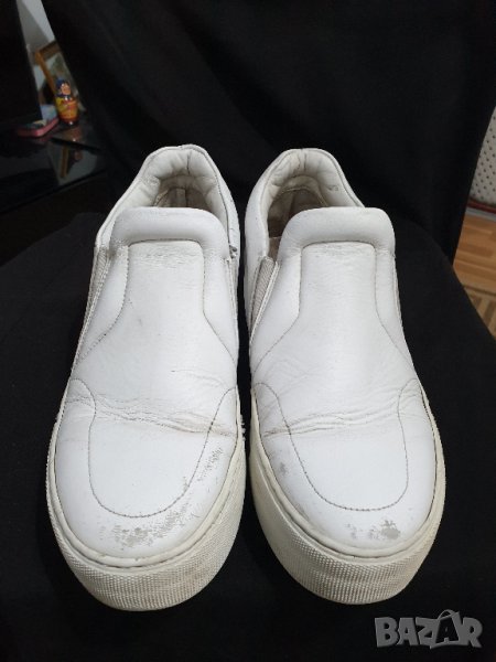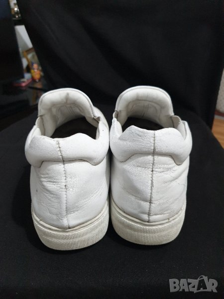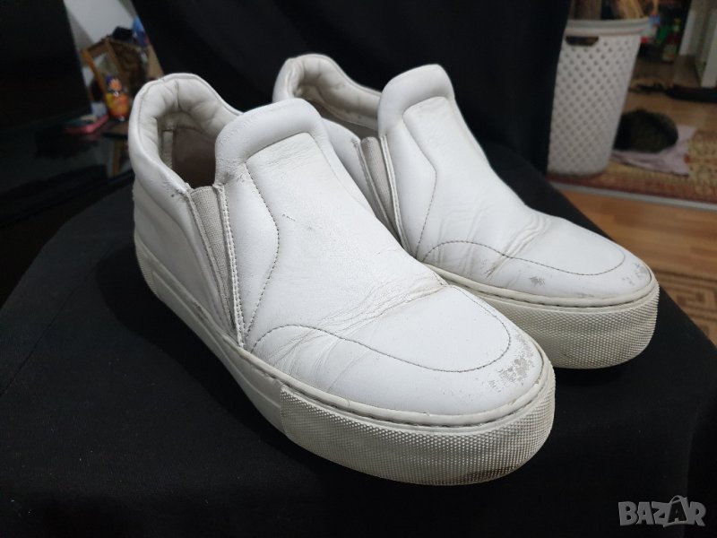 Маркови сникърси изработени изцяло от естествена кожа, отвътре и от вън, изключително здрава изработка с шита и лепена подметка която е по висока от стандартните подметки.Единственото което евентуално може да се смята като забележка се вижда на снимка 3 а това е че боята на носовете е леко одраскана, което лесно може да се отстрани с бяла боя но умишлено не е отстранено за да се вижда актуалното състояние на обувките.