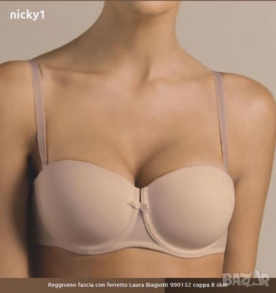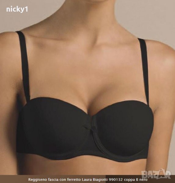 италианската марка Laura Biagiotti.Сутиена е с твърди и гладки чашки с малка подплънка в долната част на чашките..Презрамките се свалят, регулират се.Лого на марката, Колана е напълно изчистен. Състав- 92% полиамид, 8% еластан