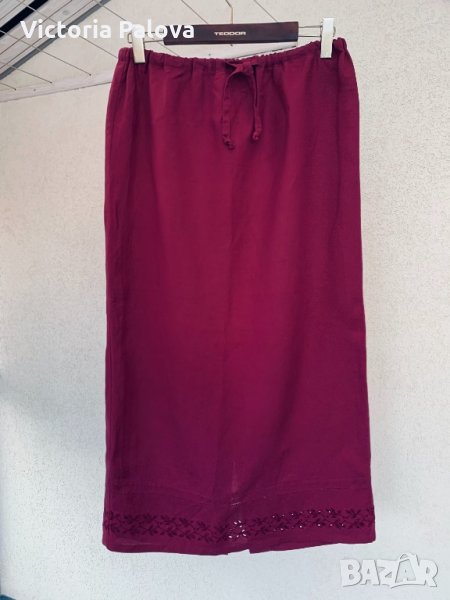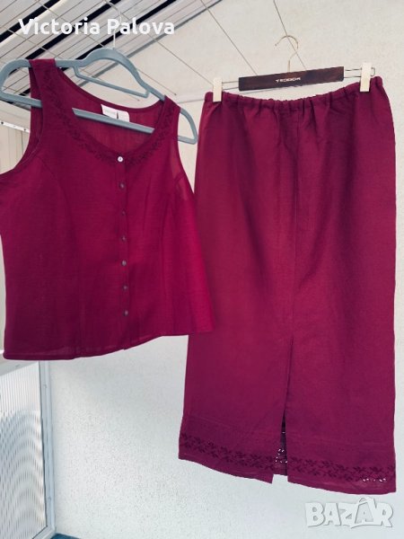 Супер красив костюм,прекрасни перлени копчета,вариативен,елекът може да се носи разкопчан с потник.полата е с ластик,разширява се до 52см,ханш-54см дължина-93см,шлиц-37,5дм.елелек:ГО-49,5см,талия-48см,дължина-54см.