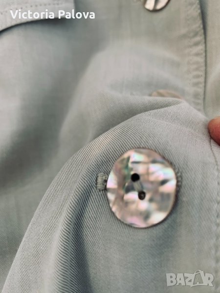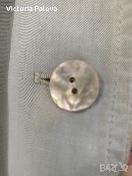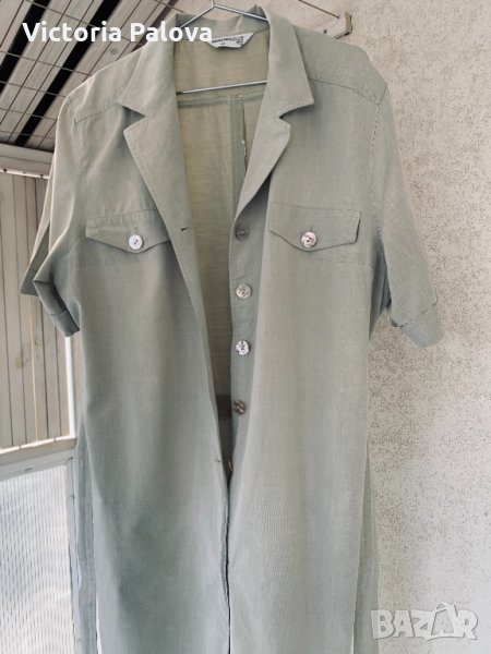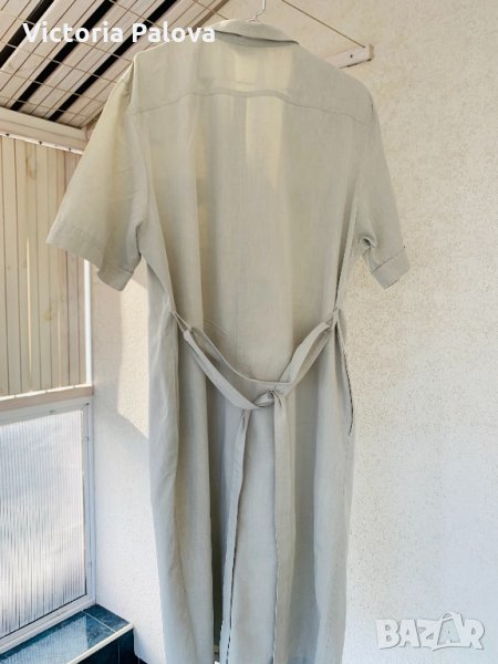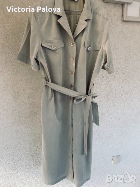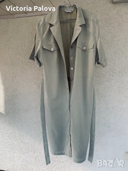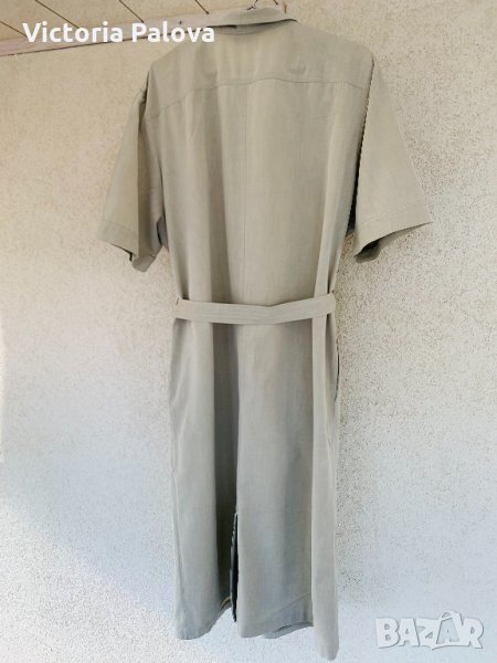 Свръхудобна рокля с много красиви перлени копчета, напомня тренчкот по кройка и цвят, отпред и отзад са шлици, 23см високи, ръкавът е по-дълъг от обикновен,30см. Рамо - 48-49см , ГО - 60-62см, талия - 57см, ханш -60см, дължина - 114-115см.