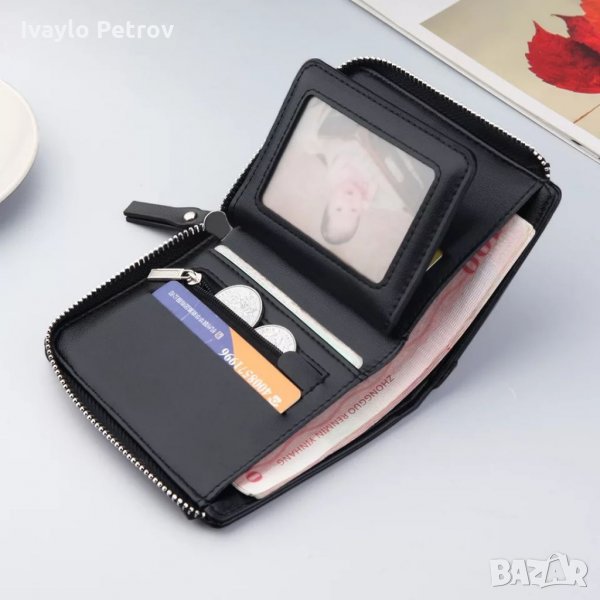 Портфейла се състои от едно дълбоко отделение, вътрешно отделение с цип за монети, 1 прозрачно отделение за снимка или лични документи!