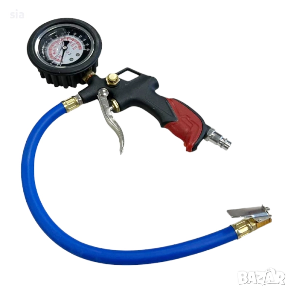 Пистолет за въздух с вграден манометър, предназначен за бързо и точно контролиране на налягането при напомпване, изпомпване и инспекция на гуми, въздушни балони, амортисьори и други приложения в автосервизи, работилници и гаражи.