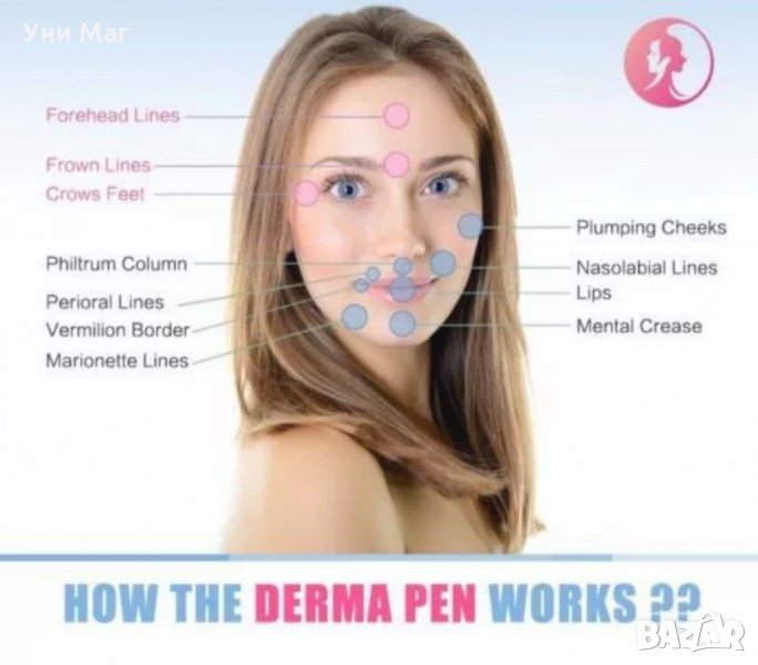 Лечението с Dermapen се извършва с патрон с броя игли, приспособени към конкретната част на тялото. Това е стерилно опакован накрайник за еднократна употреба, предназначен само за един човек наведнъж. Чрез микропункции dermapen стимулира кожата да произвежда колаген и еластин, като по този начин подпомага естествения процес на регенерация на кожата.