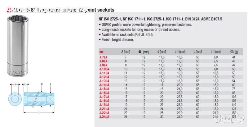 FACOM J.LA Вложка 3/8" удължена дванадесетостенна - различни размери и цени → Обява 32486427
