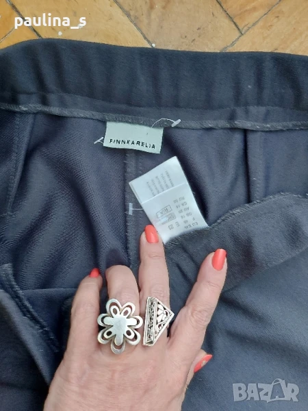 2️⃣. Колаж / Луксозен панталон "FINNKARELIA". Цената е крайна 29,99лв. Луксозен еластичен панталон с нормална талия и коси джобове. Талията е на ластик, моделът се вижда добре. Цветът е сиво - син "Графит". Материята е еластична и плътна, съдържа 20% вълна и 80%полиестер - немачкаема с лек кожен ефект.