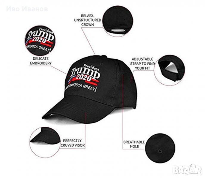 Всекидневна бейзболна шапка в стила на президента на USA Доналд Тръмп. Налична в цвят черни и бели бродирани букви-“ Keep Make America Great“, същата каквато носят сенаторите от републиканската партия. Шапката е от текстил памук, със стандартен размер 58.С помощта на настройващо коланче се регулира размера на окръжността на главата от 55-62 см. Минимална стойност на окръжността на главата 56 см, максимална стойност на окръжността на главата 60 см. Козирка с размери 7 х 16 см.