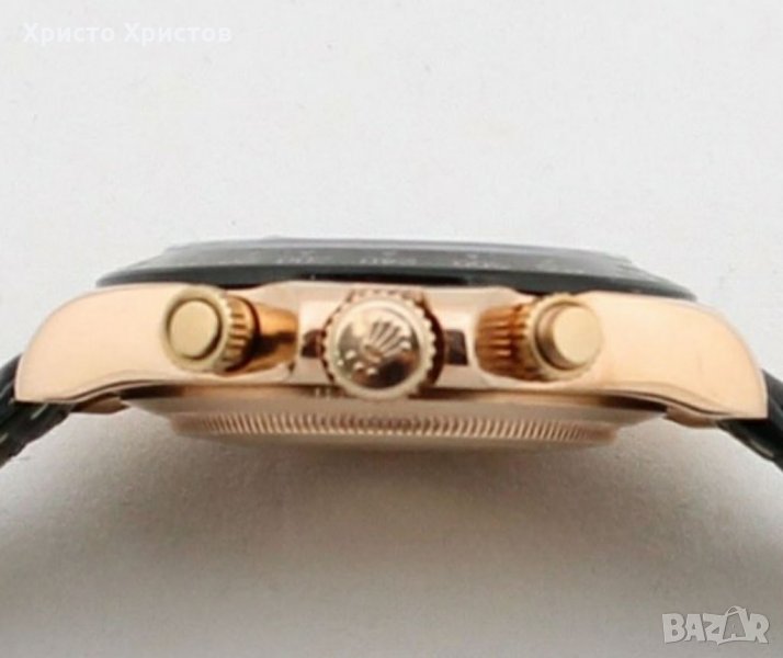 часовник Rolex Daytona, механичен, автоматик, кафяв циферблат с дата, месец и функция 24 часа, фосфоресциращи стрелки, арабски цифри, полиран стоманен корпус розово злато и черна кожена каишка с оригинално закопчаване.