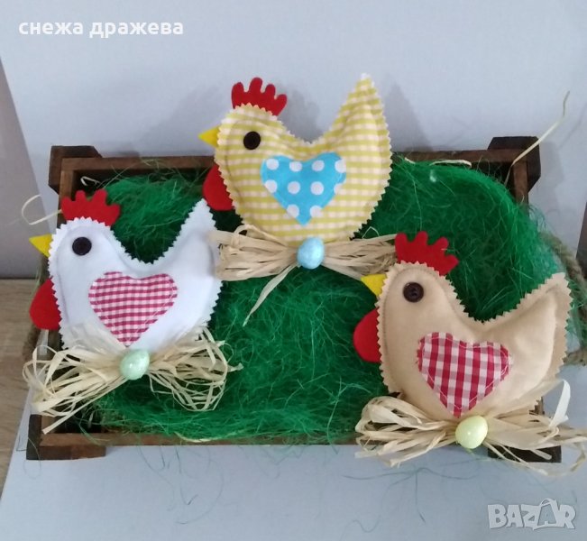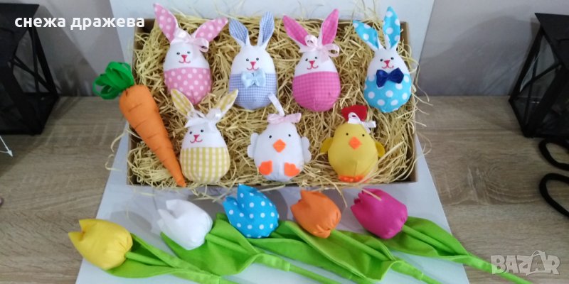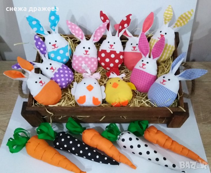 Ръчно изработена декорация от текстил. Цена:яйцезайчета и морковчета по 4лв за бр, кокошки три вида по 6лв. Зайчета от деним 10лв