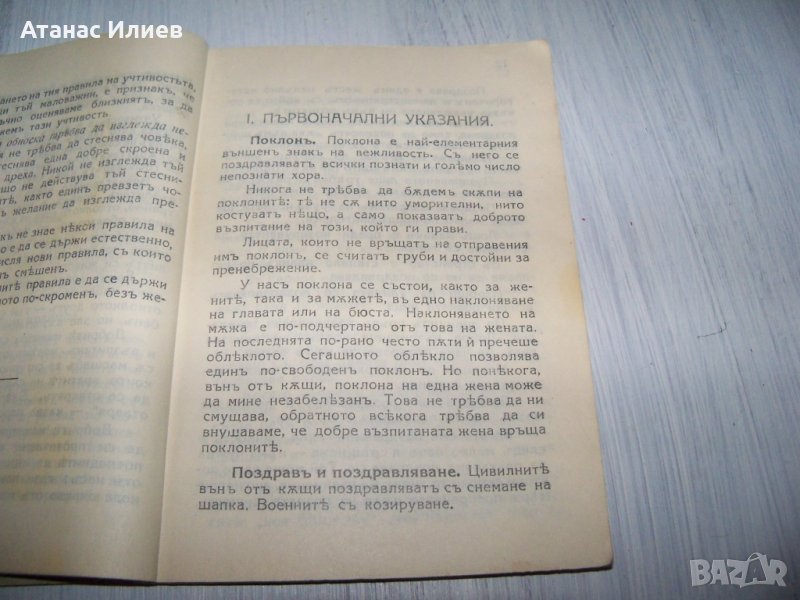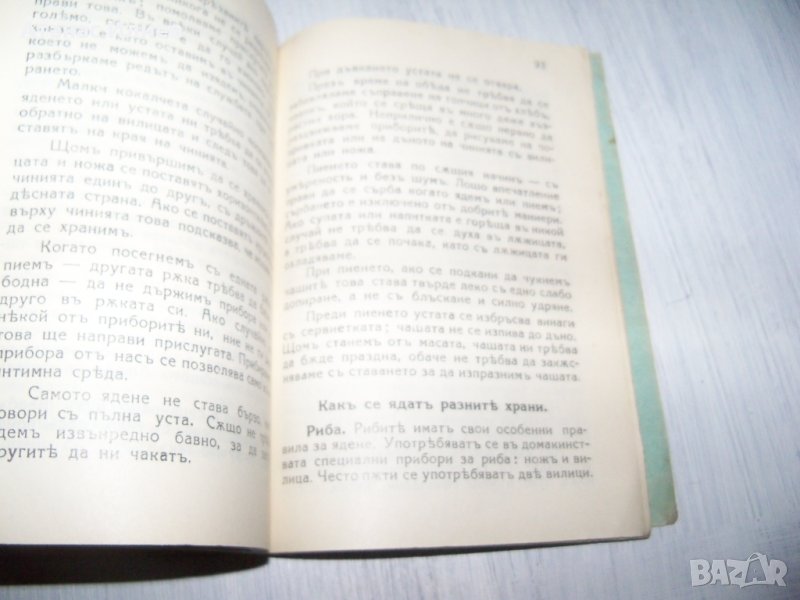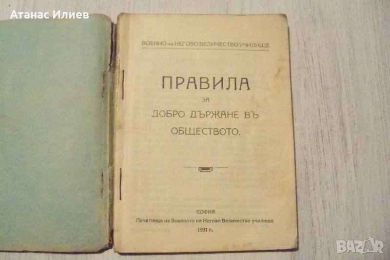 Изключително интересна книга "Правила за добро държание в обществото" издание на Военно на Негово Величество Училище от 1931г. Книжката е с меки корици, 111 стр. Включва съвети към офицерите за това, как да общуват, да правят визити, да се хранят и т.н. Книжката е в много добро състояние.