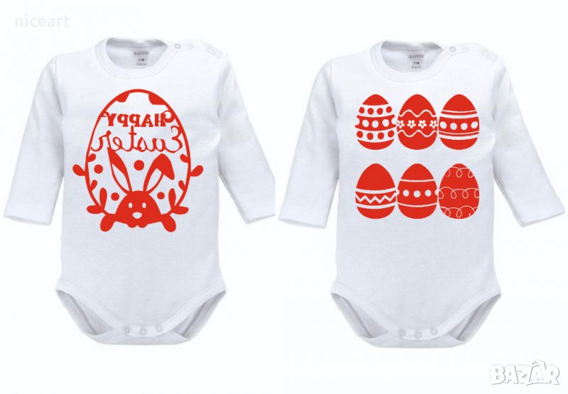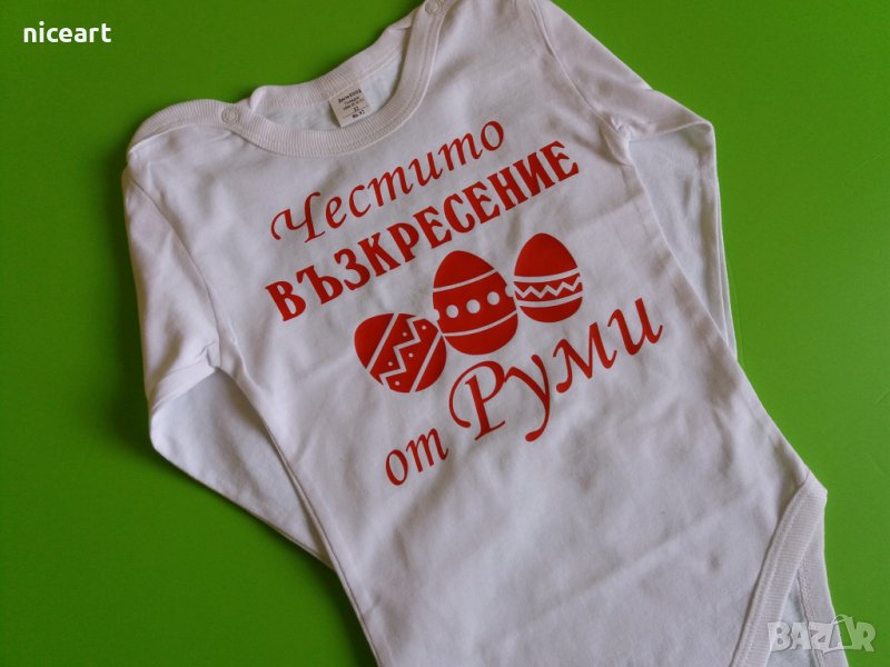 При нас може да поръчате великденско боди с надпис и име на вашето бебче.Цвят на надписа по ваш избор.Разполагаме с над 20 модела бодита -бели,червени и сини с различни щампи,с къс или с дълъг ръкав