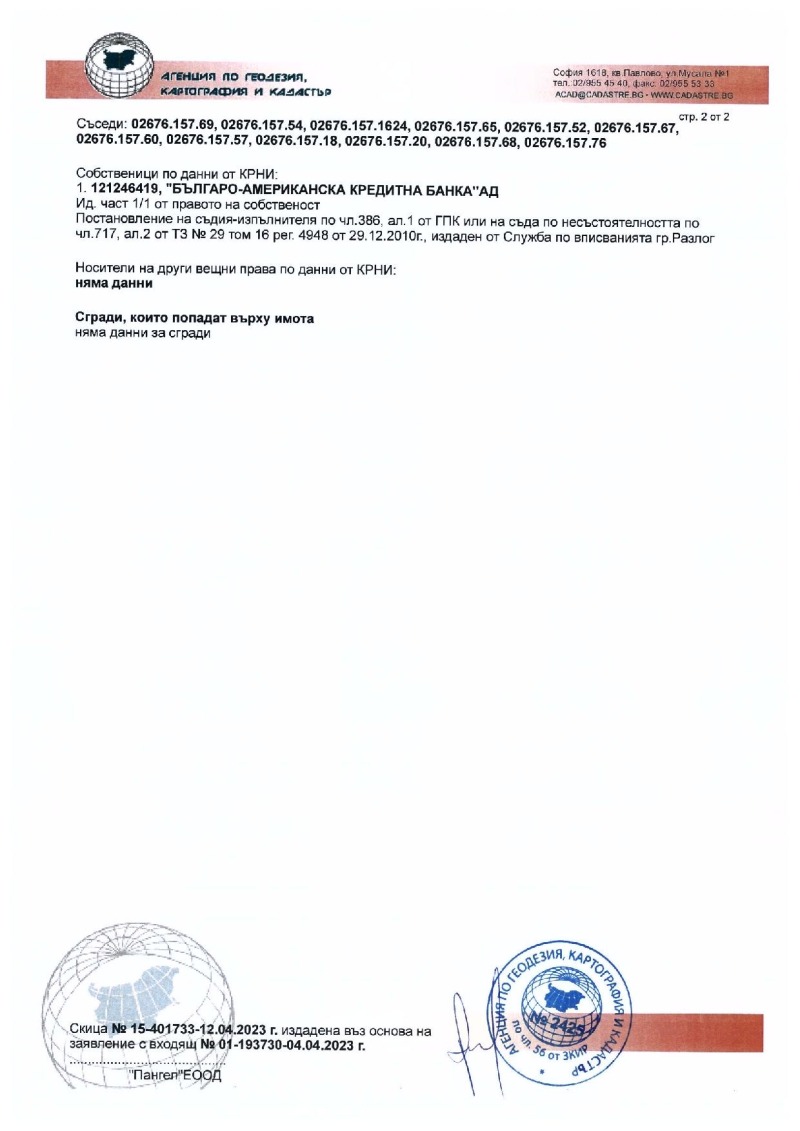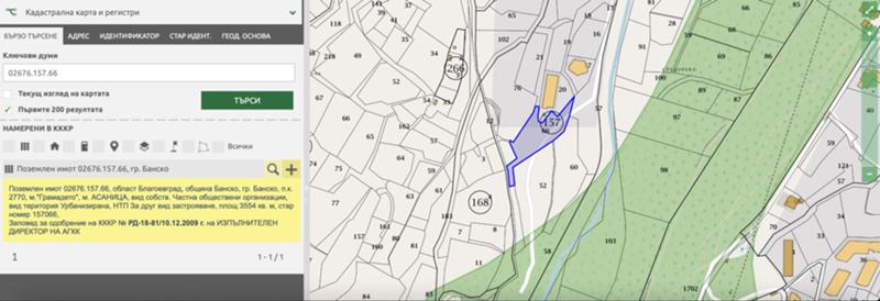Поземлен имот 02676.157.66, област Благоевград, община Банско, гр. Банско, п.к. 2770, м.'Грамадето', м. АСАНИЦА, вид собств. Частна обществени организации, вид територия Урбанизирана, НТП За друг вид застрояване, площ 3554 кв. м, стар номер 157066,