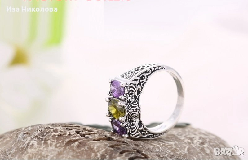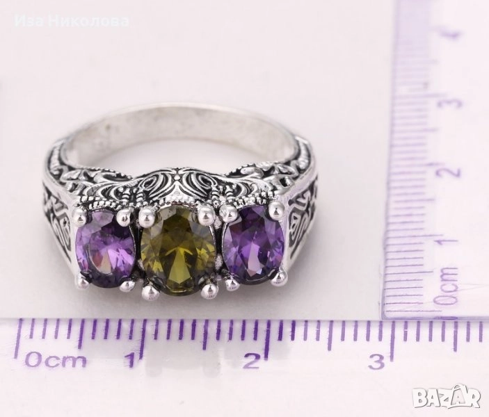 Сребърен пръстен размер 9 със сапфири, австрийски кристали и аметист.снимка 1 и 2 - цена 29.99лв