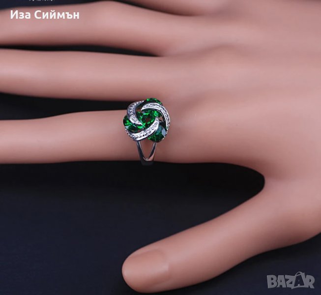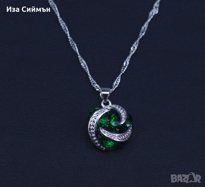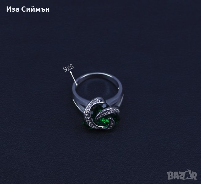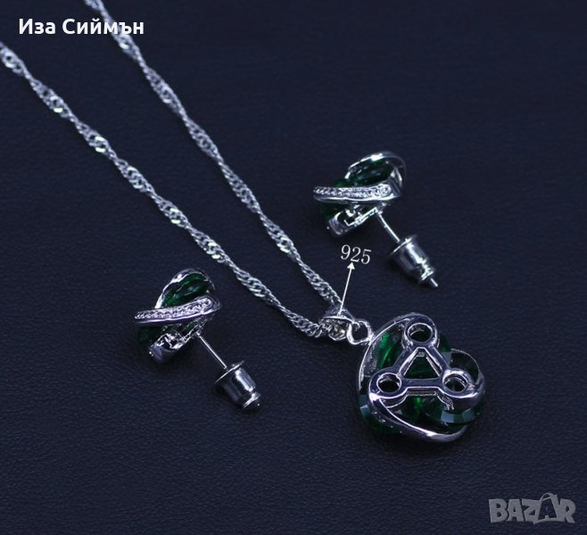 Сребърен комплект обици, медальон и пръстен със смарагд → Обява 32502580